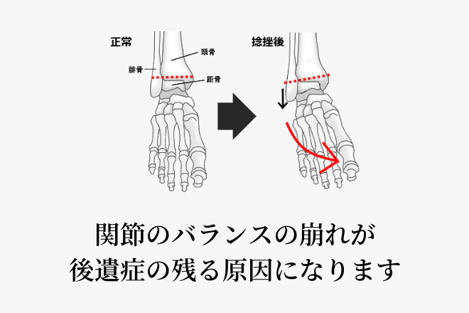 そんなキツい後遺症に悩まされる方は、靭帯の損傷だけでなく、足首周りの関節のバランスが崩れてしまっているケースが非常に多いです。