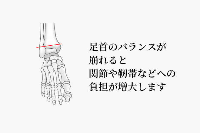 足首の関節のバランスが崩れてしまうと、筋肉や靭帯に常に大きな負担がかかってしまい、痛みや違和感を引き起こす原因になってしまいます。
