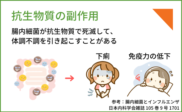 抗生物質を飲むと、腸内細菌の多くが死んでしまうため、菌が食べものを上手く分解、消化できなくなってしまいます。