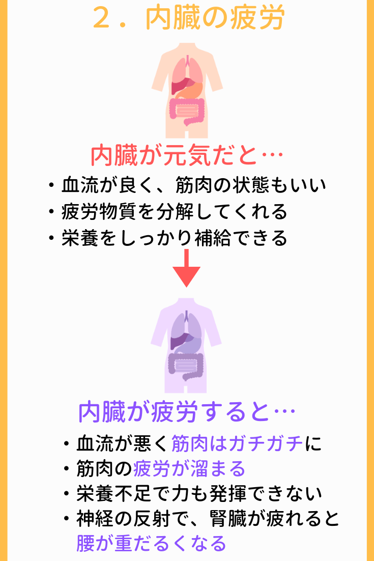 内臓は運動をしていない時には体の中でもっとも血液が流れ込む場所でもあるため、内臓が疲労すると全身の血流が悪くなり、腰も血流が悪くなります。