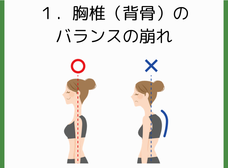 背中の丸い状態が続くと、背骨の骨格のバランスが崩れていき、背中のカーブがキツクなってしまいます。
