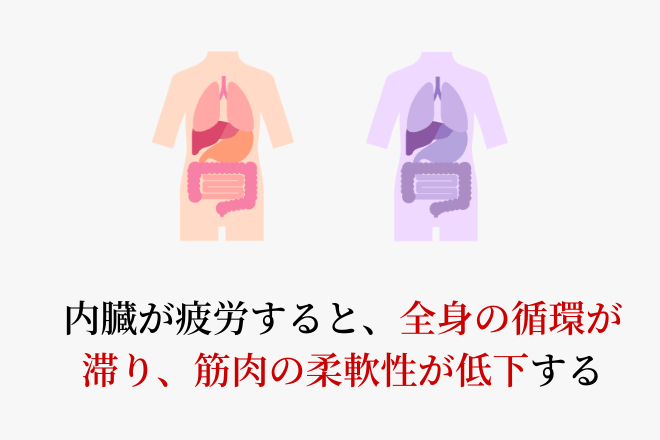 肝臓や腎臓といった内臓は、疲労物質を分解しており、同時に下半身への循環に大きな影響を与えています。